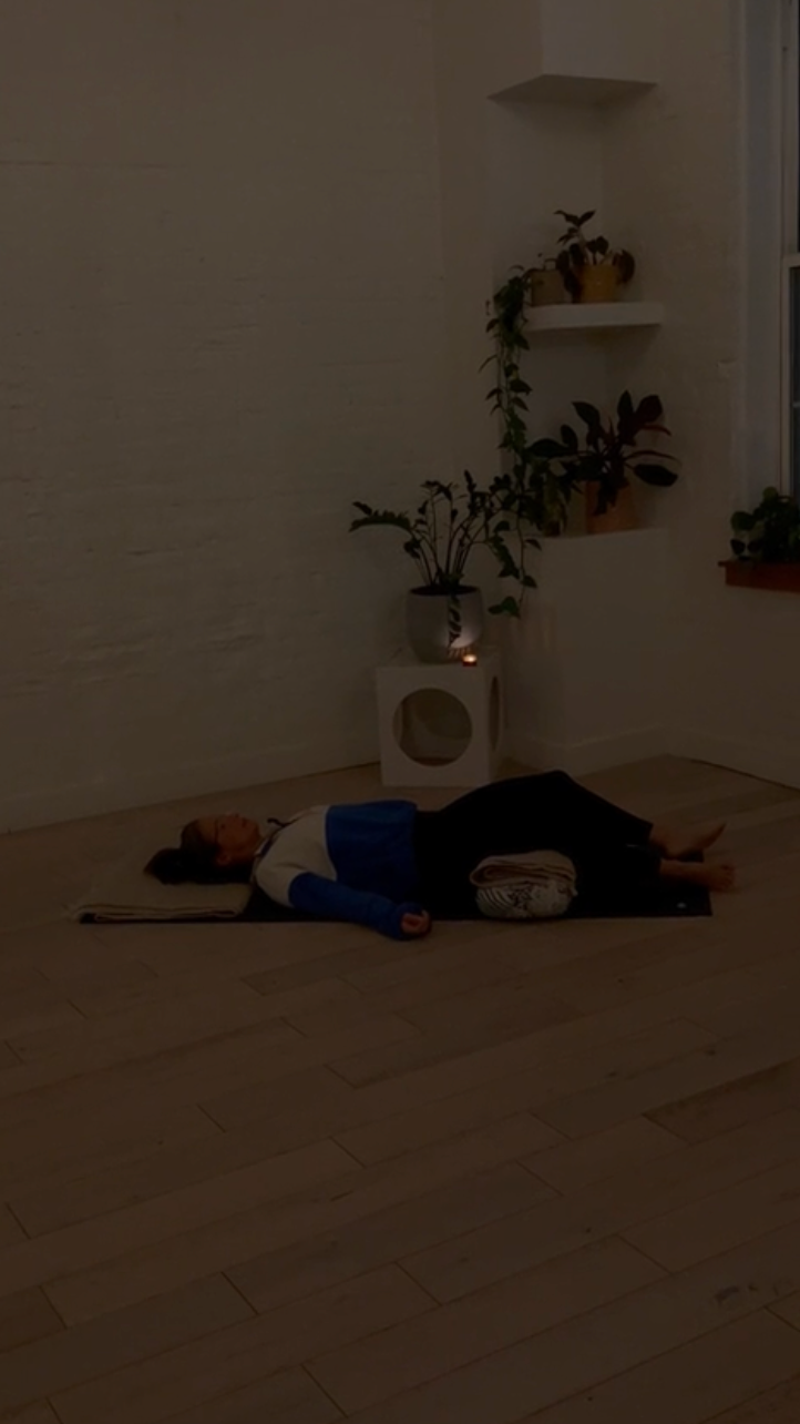 Here is where we gradually shift from physical sensation towards deeper relaxation. Our yin practice primes us to further deepen through restorative yoga — gentler, opening postures that are designed to promote mental clarity, healing and down-regulation. These shapes are held for 5-10 minutes, offering us more space and time to slow down and feel maximally supported.